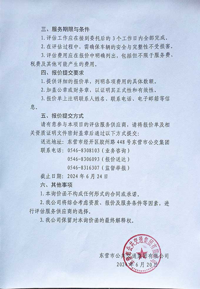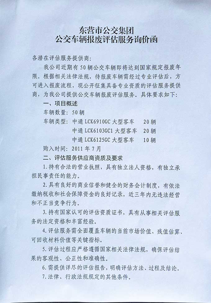 我公司近期有50輛公交車輛即將達到國家規定報廢年限。根據相關法律法規,待報廢車輛需經過專業評估后,方可進入報廢流程,現公開征集具備專業資質的評估服務提供商,為我公司提供公交車輛報廢評估服務。具體要求如下: