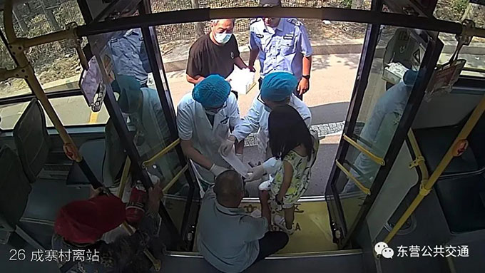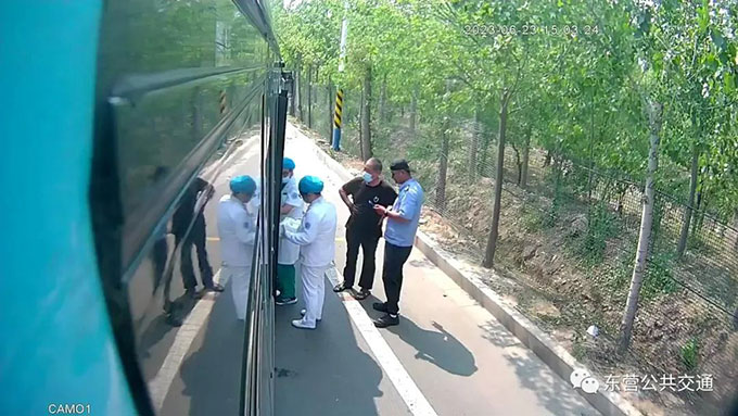 救人后的孫建強仔細檢查了三人的傷勢,“由于電動車側翻擠壓,大爺胳膊受傷,被扎了玻璃碴子,大娘腰部受傷,小女孩的眼睛受了傷,腿也受了傷,我就趕緊撥打了120?!蓖瑫r,孫建強向所在車隊匯報了遇到的突發情況。車隊領導當即表示,安頓好車內乘客,先救傷者。在等待救護車到來的時間,孫建強從公交車上拿了些衛生紙和礦泉水,簡單幫三人清理了傷口。23日的東營正是高溫天,氣象臺發布了高溫紅色預警,當天的氣溫最高達到了41攝氏度,非常炎熱,“我們的公交車上都開著空調,我就把他們扶到公交車上休息。”救護車很快就來了,醫護人員在給傷者進行包扎的時候,孫建強一邊安撫老人,一邊向老人詢問要不要幫忙聯系家人,老人告訴了他村里書記的電話。經聯系,村大隊書記表示立即安排相關人員跟進。
