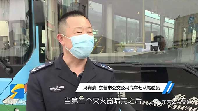 恰巧在這個時候,東營市公交公司公交車駕駛員馮海清駕駛178路公交車行駛至東營市一中站點附近,于是帶著車上的滅火器趕緊上前施救。然而噴完一罐滅火器后,煙依然很大,馮海清便趕忙回到車廂拿了兩罐,當第二個滅火器噴完之后,火勢得到有效控制,最終在噴完第三罐滅火器后,徹底把火撲滅了。