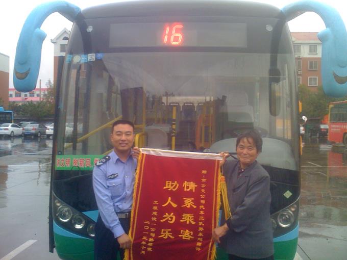 10月14日下午,一位老太太拿著一面寫有“情系乘客,助人為樂”的錦旗,來到市公交公司汽車三隊(duì)辦公室,對(duì)16路駕駛員孫永超表示致謝,也為公交公司和車隊(duì)培養(yǎng)了如此優(yōu)秀的員工表示敬意……