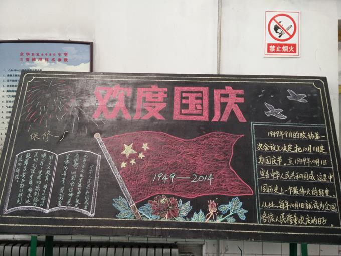 今年是建國65周年,市公交公司保修一廠利用周末時(shí)間精心制作了一副黑板報(bào),來表達(dá)對(duì)祖國母親生日的祝福。 黑板報(bào)是保修廠文化的重要窗口之一,既體現(xiàn)了保修廠的特色和氣質(zhì),又營造了喜迎國慶的節(jié)日氛圍,職工們有的刷黑板、有的找資料、有的畫圖案、有的書寫,大家在辦板報(bào)的過程中,相互協(xié)作,共同祝福祖國繁榮昌盛、公交事業(yè)蒸蒸日上。