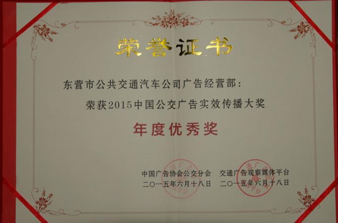 金秋季節,中國廣告協會公交分會舉行的“2015中國公交廣告實效傳播大獎”評選活動揭曉,東營市公交公司廣告部以《請給老人讓個座》、《食之殤》、《創興牛仔》、《大地乳業》四系列參賽作品,喜獲年度優秀獎,這表明在全體創意設計人員的共同努力下,我們的設計水準已經躋身到行業的最高層面,具備了一定的競爭能力,這一獎項,將激發全體廣告職工以更加飽滿的工作熱情,投身到激烈的行業競爭當中,創造出更好的經濟效益和社會效益。