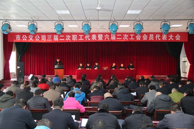 2017年2月12日上午8:30分,市公交公司召開了三屆二次職工代表暨六屆二次工會會員代表大會。大會共有代表88人,實到85人,請假3人,列席代表13人。大會對2016年度公司先進集體及先進個人進行了表彰;公司領導為2016年度先進集體、優秀黨支部、先進個人頒發了獎牌和證書;審議通過了公司經理做的《2017年公司工作報告》、工會主席做的《2017年公司工會工作報告》以及《公司2017年財務工作報告》、《公司行車安全制度修改草案》、《公司加氣(油)站安全管理暫行辦法》等事宜。