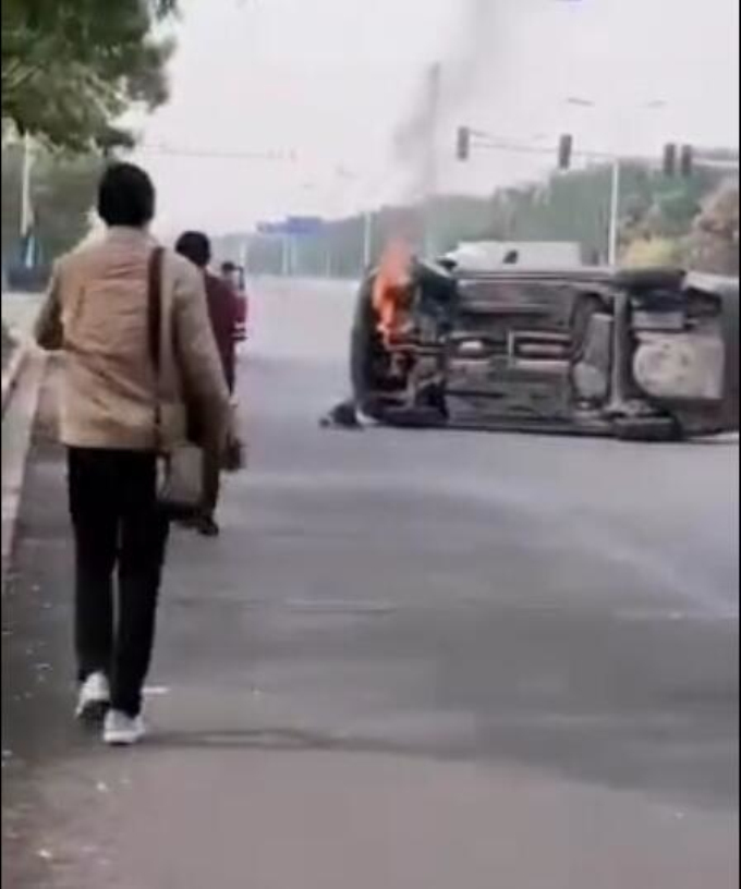 東營一轎車側翻起火!危急時刻公交車司機出手了…
