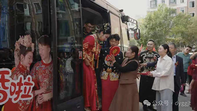 新娘老家的親戚朋友大多是第一次到東營來,他們通過這場婚禮感受到了東營人民的熱情好客,“這里民風淳樸,結婚也是熱熱鬧鬧,孩子嫁到這里我們很放心。”娘家人對于東營的結婚習俗表示非常欣賞。新娘的好朋友們也有很多遠道而來的,“我們也是第一次在現實生活中見到用公交車當婚車的這種方式,太有趣了。”他們紛紛拍下視頻,要推廣這種節約而有意義的結婚方式,“公交車車廂空間大、坐的人又多,還可以進行個性化布置,同時能讓家人朋友共享這段浪漫旅途的喜悅,共同見證這一幸福瞬間,更有儀式感與氛圍感。”