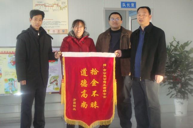 12月11日上午,東營經(jīng)濟(jì)開發(fā)區(qū)方圓銅業(yè)的武繼峰先生拿著一面寫有“拾金不昧、道德高尚”的錦旗來到市公交公司汽車五隊(duì),感謝161路駕駛員王清娟師傅拾金不昧的高尚品德。據(jù)車隊(duì)了解得知,12月9日晚上,汽車五隊(duì)駕駛員王清娟在運(yùn)行完161路班次后正常清理車廂衛(wèi)生時(shí)發(fā)現(xiàn)了一個(gè)女士皮包并立即將皮包上交車隊(duì)。車隊(duì)值班人員通過清點(diǎn),發(fā)現(xiàn)皮包內(nèi)共有現(xiàn)金、手機(jī)、鑰匙、身份證、個(gè)人用品等,根據(jù)包里面的手機(jī)信息及時(shí)聯(lián)系到了失主的丈夫武繼峰先生。12月10日上午武繼峰先生帶著有效證件來車隊(duì)將包領(lǐng)回?;丶液螅淅^峰先生心情久久不能平靜,特意制作了一面錦旗送到車隊(duì),代表全家來表達(dá)感激之情,武繼峰先生拿著錦旗,握著王隊(duì)長的手,非常激動的連連表示感謝,并再三要求車隊(duì)對王清娟師傅這種拾金不昧的優(yōu)良品質(zhì)進(jìn)行表揚(yáng)。王隊(duì)長非常坦誠的告訴武繼峰先生,拾金不昧是我們公交行業(yè)多年來始終堅(jiān)持秉承的優(yōu)良傳統(tǒng),也是每名駕駛員應(yīng)盡的義務(wù),是我們公交人義不容辭的責(zé)任。